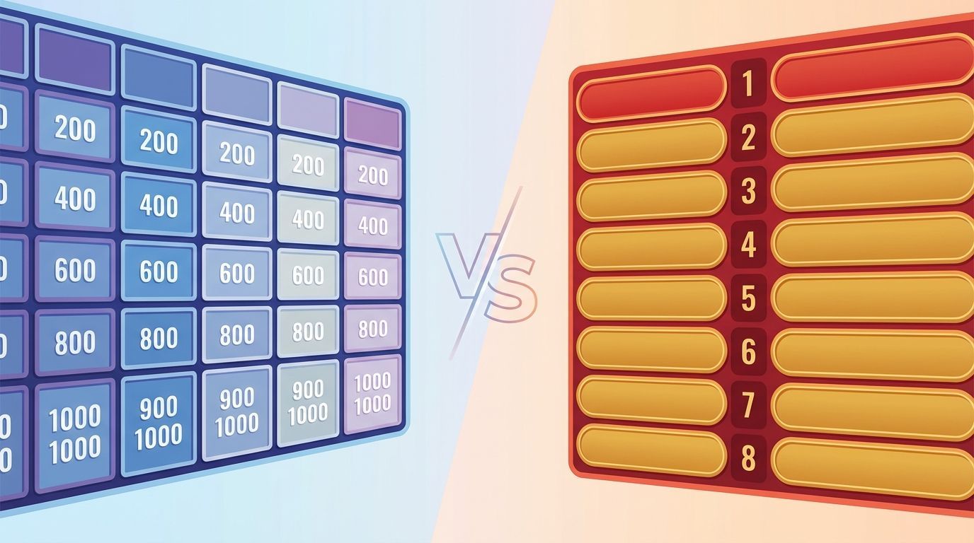 Jeopardy and Family Feud are the two most popular game show formats for events — and for good reason. They're both recognizable, easy to explain, and genuinely fun. But they couldn't be more different in how they play.