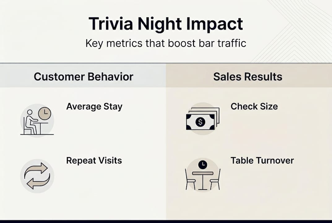 These numbers reflect real-world results from venues implementing consistent trivia programs. The extended stay duration naturally increases consumption. A customer might order one beer during a typical 45-minute visit, but will easily consume three drinks plus food during a two-hour trivia event.