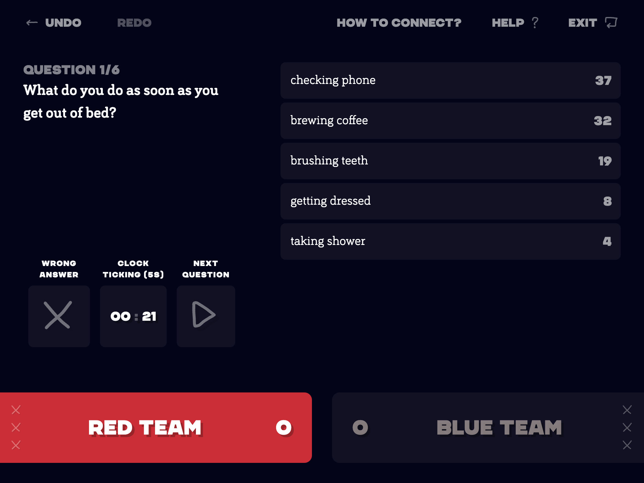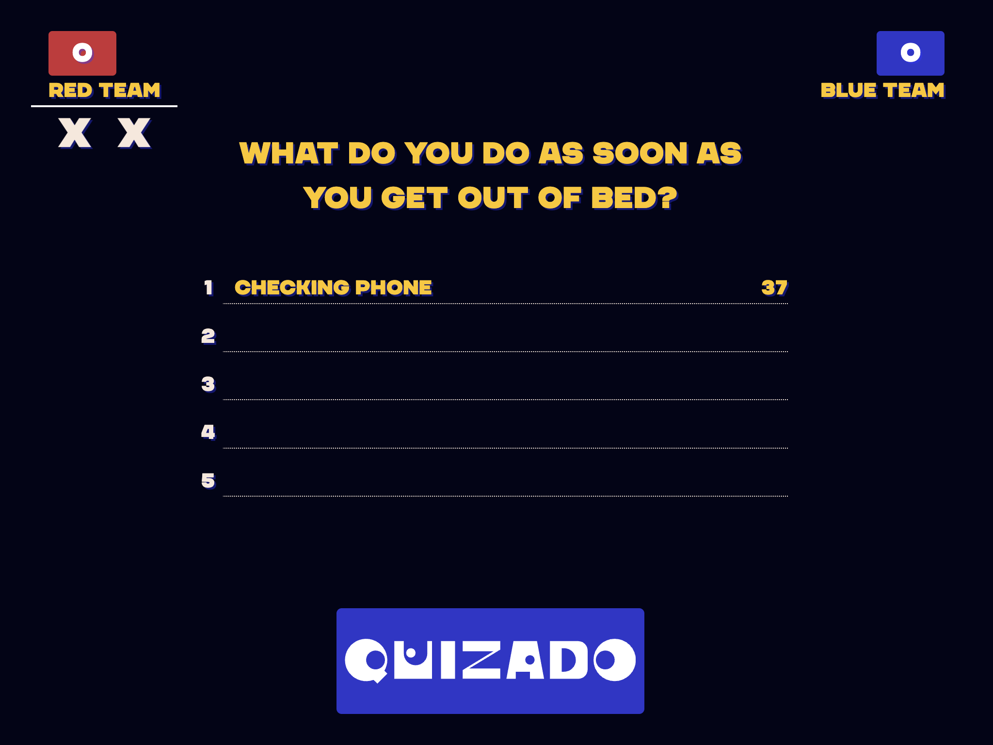 Teams collaborate to guess popular survey responses. Encourages communication, empathy, and understanding how others think.